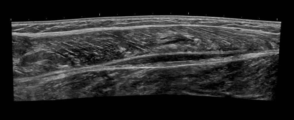Immagine 4: Vista longitudinale panoramica del polpaccio che mostra la raccolta di liquido attorno al tendine del plantare rotto.