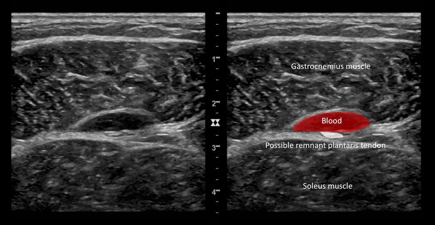 Questo è tipico della rottura del muscolo / tendine del plantare, dove il sangue si accumula nel piano interfasciale che circonda il tendine del plantare lesionato. La rottura tende a verificarsi a livello della giunzione miotendinea.